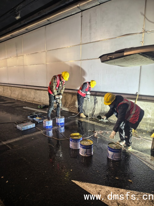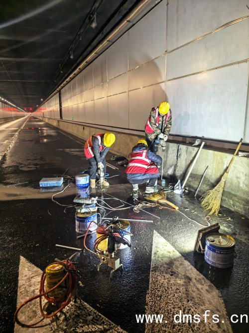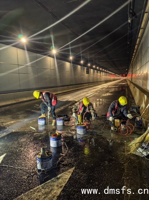 该隧道因长期受地下水位变化、温差及结构沉降影响,伸缩缝部位出现明显渗漏水,不仅影响隧道正常通行,更对结构安全与使用寿命构成潜在威胁。作为拥有近 20 年专业防水堵漏经验的系统服务商,德美斯凭借成熟的技术方案、高效的施工团队与丰富的市政工程案例,成功承接本次项目的维修工作。