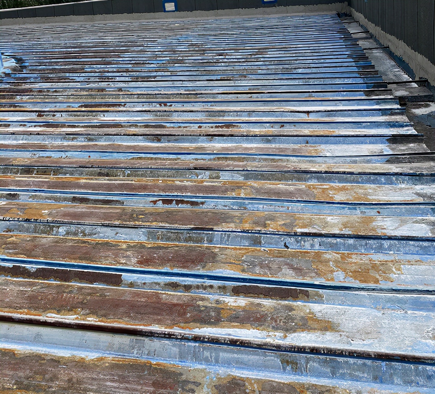 该汽车公司屋面为金属屋面,屋面面积约为1200多平,已投入使用10余年。由于受天气、环境、材料质地等因素影响,金属表面与空气中水分、氧气发生化学电化反应,产生锈蚀,从而引起渗漏。