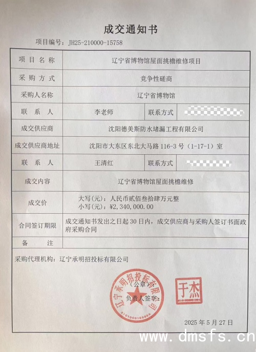 近日,德美斯在建筑修缮领域再传佳音!我们凭借卓越的技术实力与丰富的防水经验,成功中标辽宁省博物馆屋面挑檐维修项目,将为这座承载历史与文化的省级地标建筑注入专业守护!