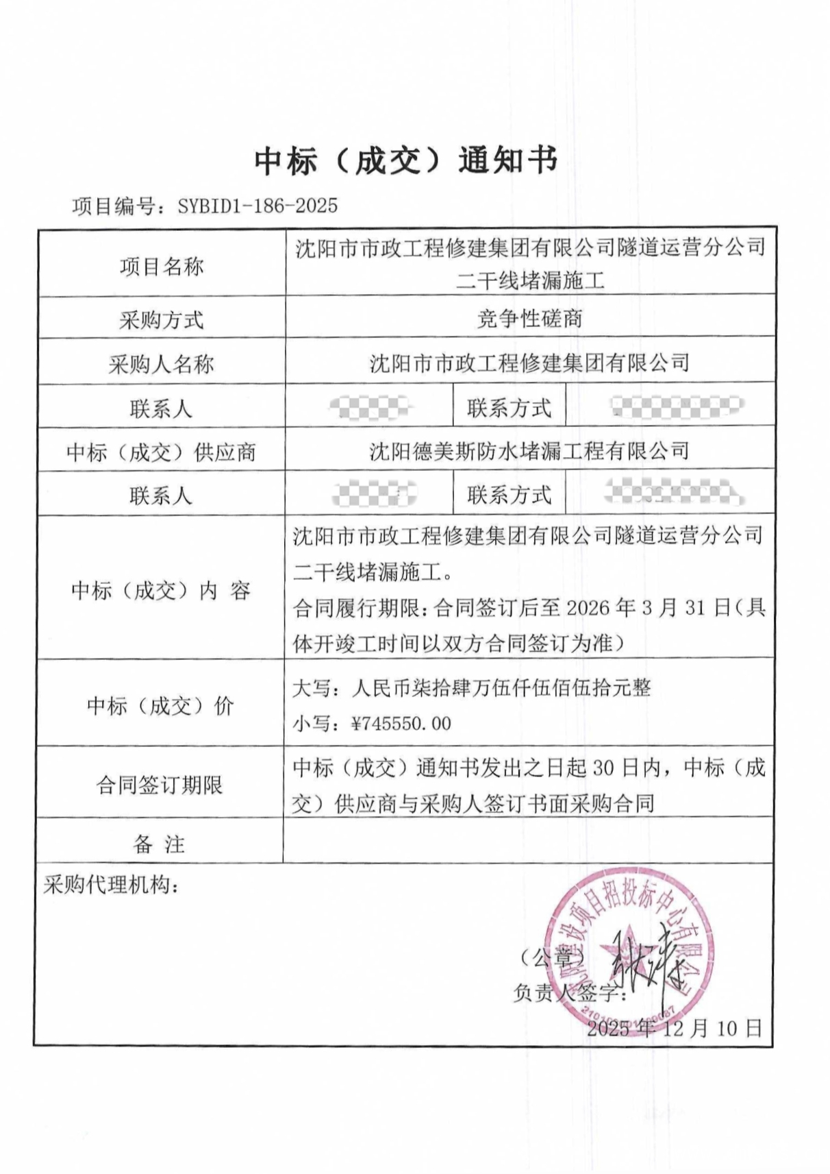 年末传来捷报!德美斯凭借领先的技术实力与丰富的工程经验,成功中标沈阳某隧道渗漏维修项目。此次中标不仅是客户对德美斯综合能力的权威认可,更彰显了公司在隧道防水堵漏领域的专业领先地位。